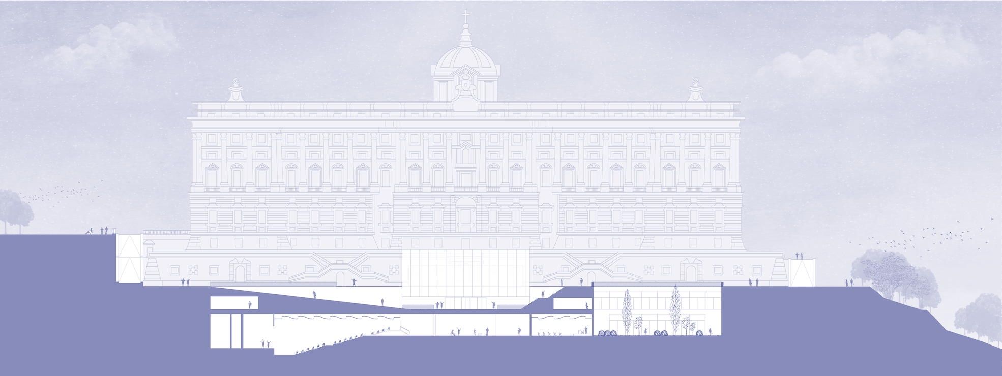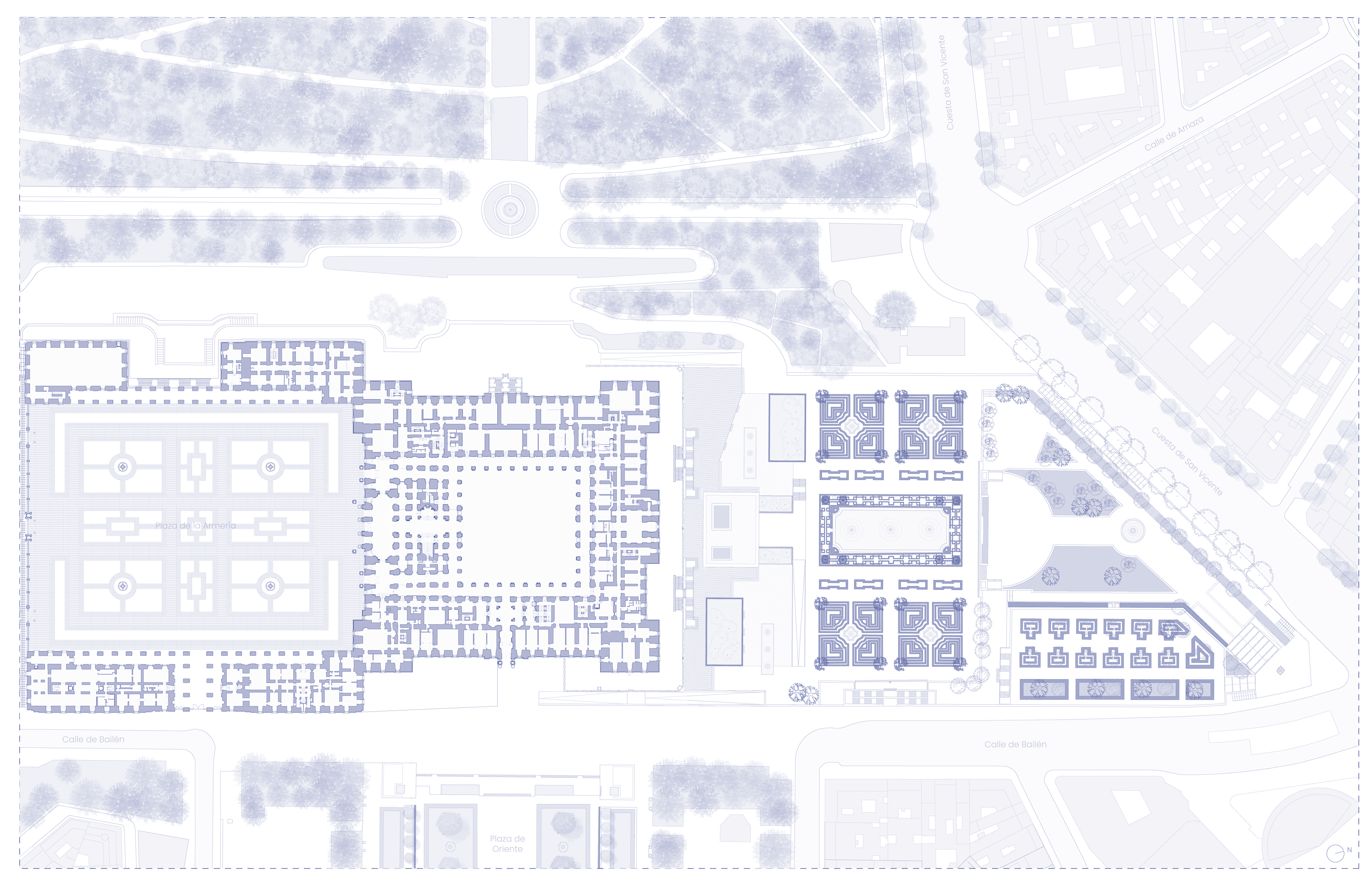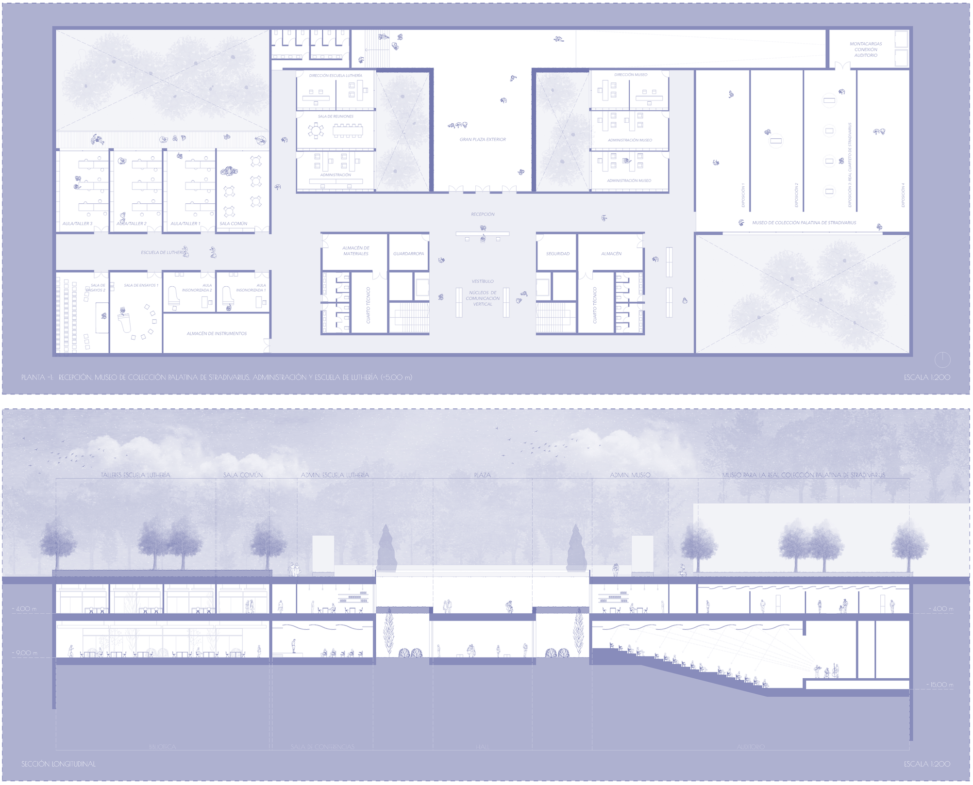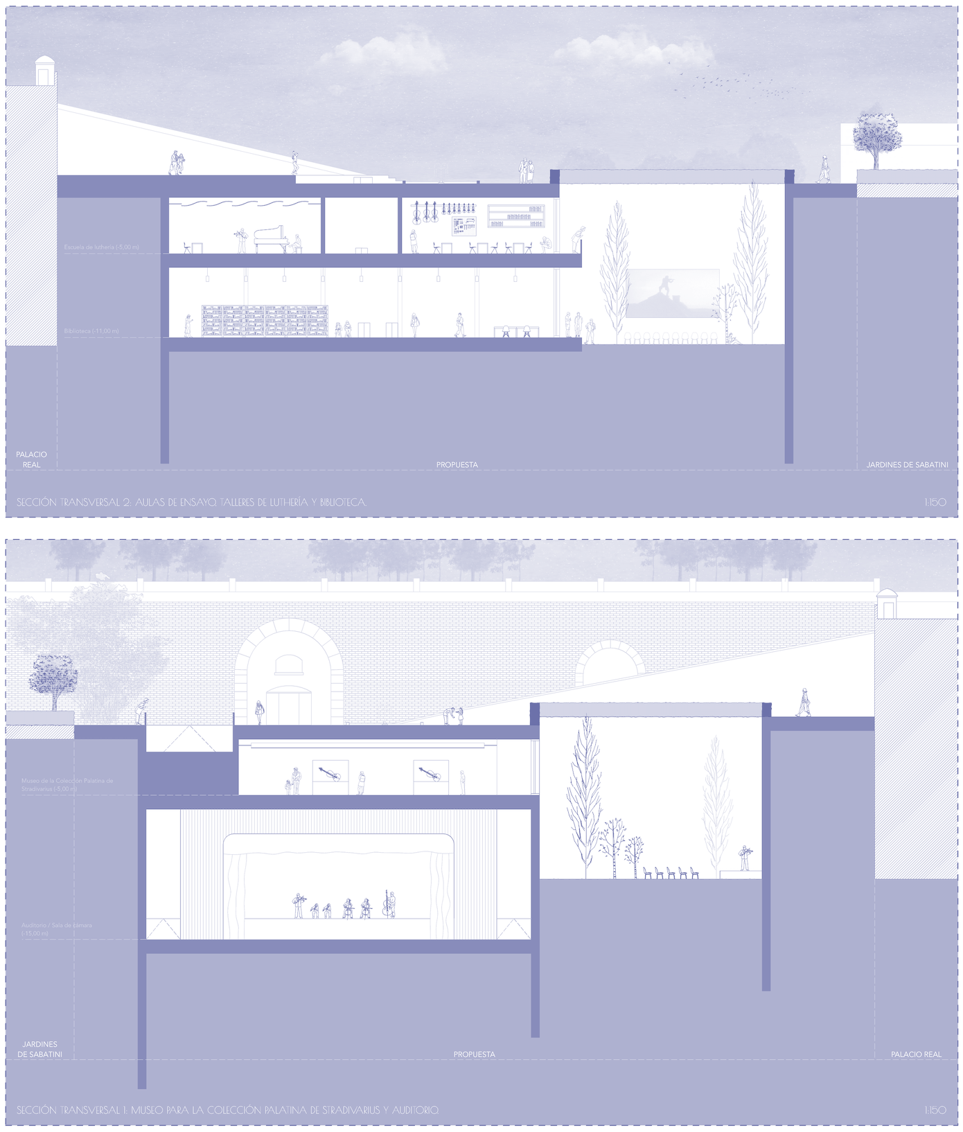 Para evitar competir con la Fachada Norte del Palacio Real, preservar su protagonismo y establecer conexiones directas con los jardines que rodean al mismo, se plantea un paisaje telúrico, es decir, un entorno formado a partir del moldeado del suelo en conjunción con la arquitectura, enterrada bajo la cota de la plaza y conformada por dos plantas que albergarán nuevos usos de interés turístico y cultural, todos ellos ligados a la música: museo para la colección palatina de Stradivarius, escuela de luthería, auditorio… Se genera por tanto un nuevo espacio que reconectará el Palacio Real y sus alrededores con la ciudad de Madrid.