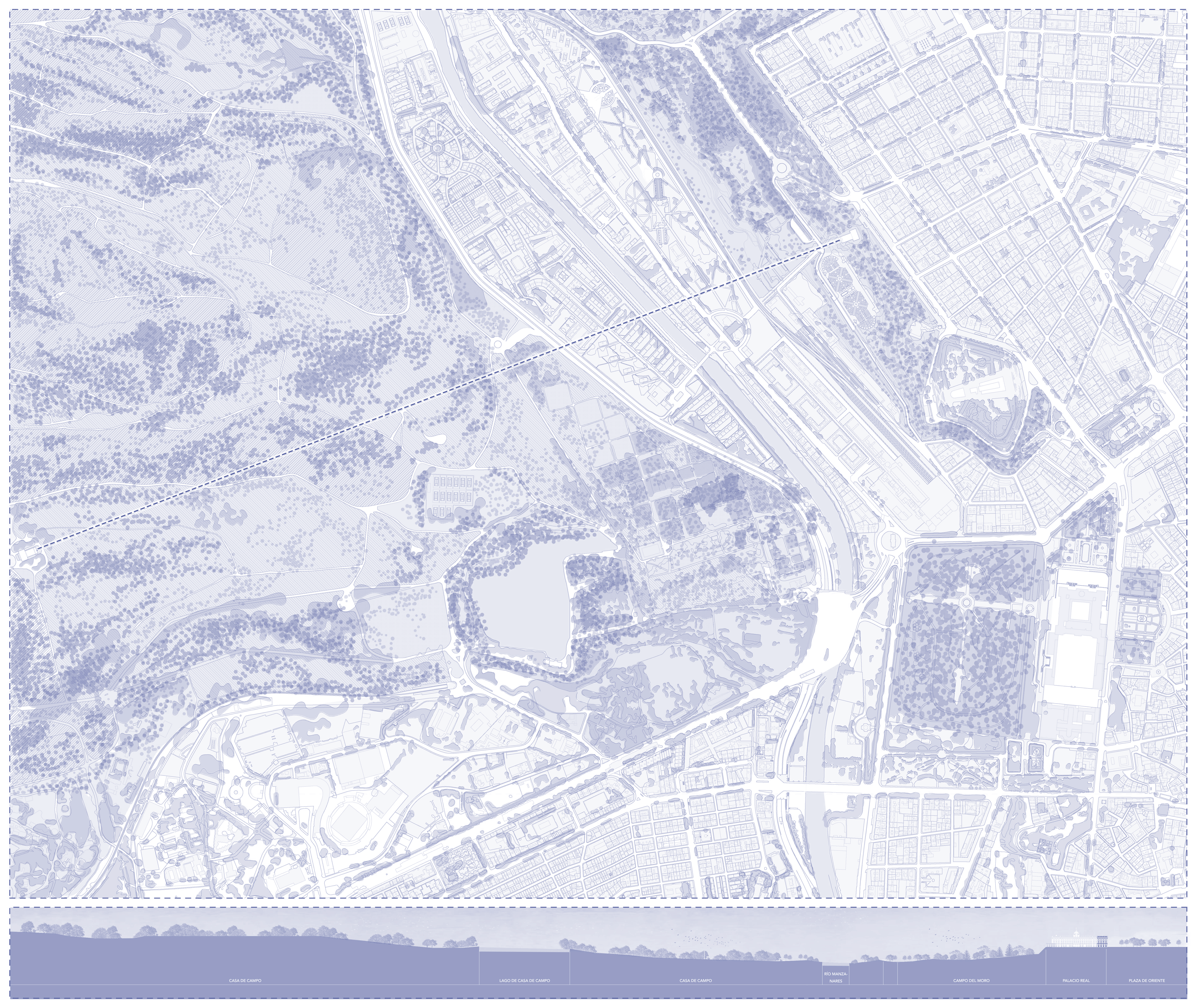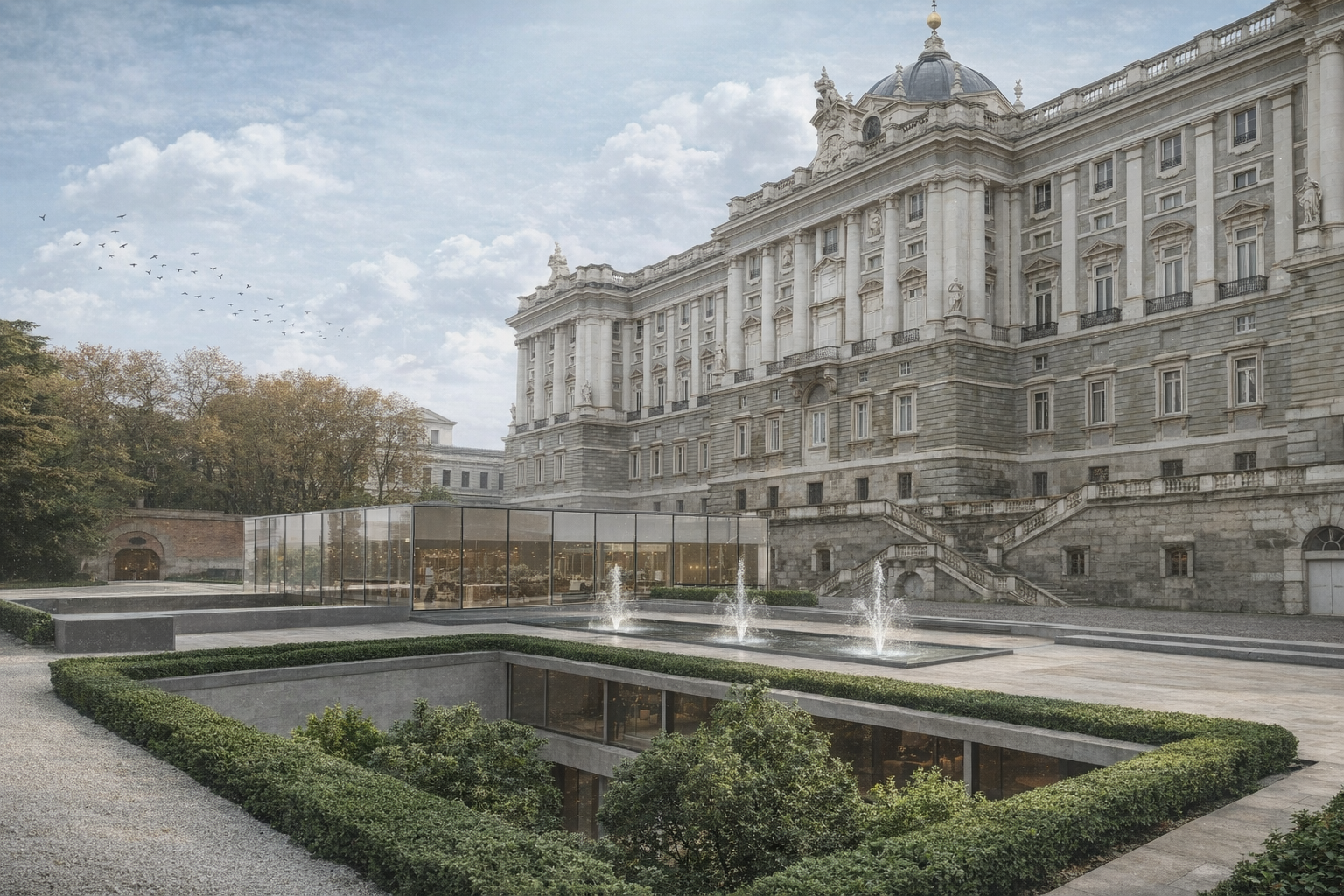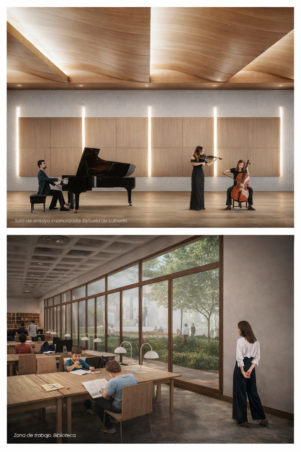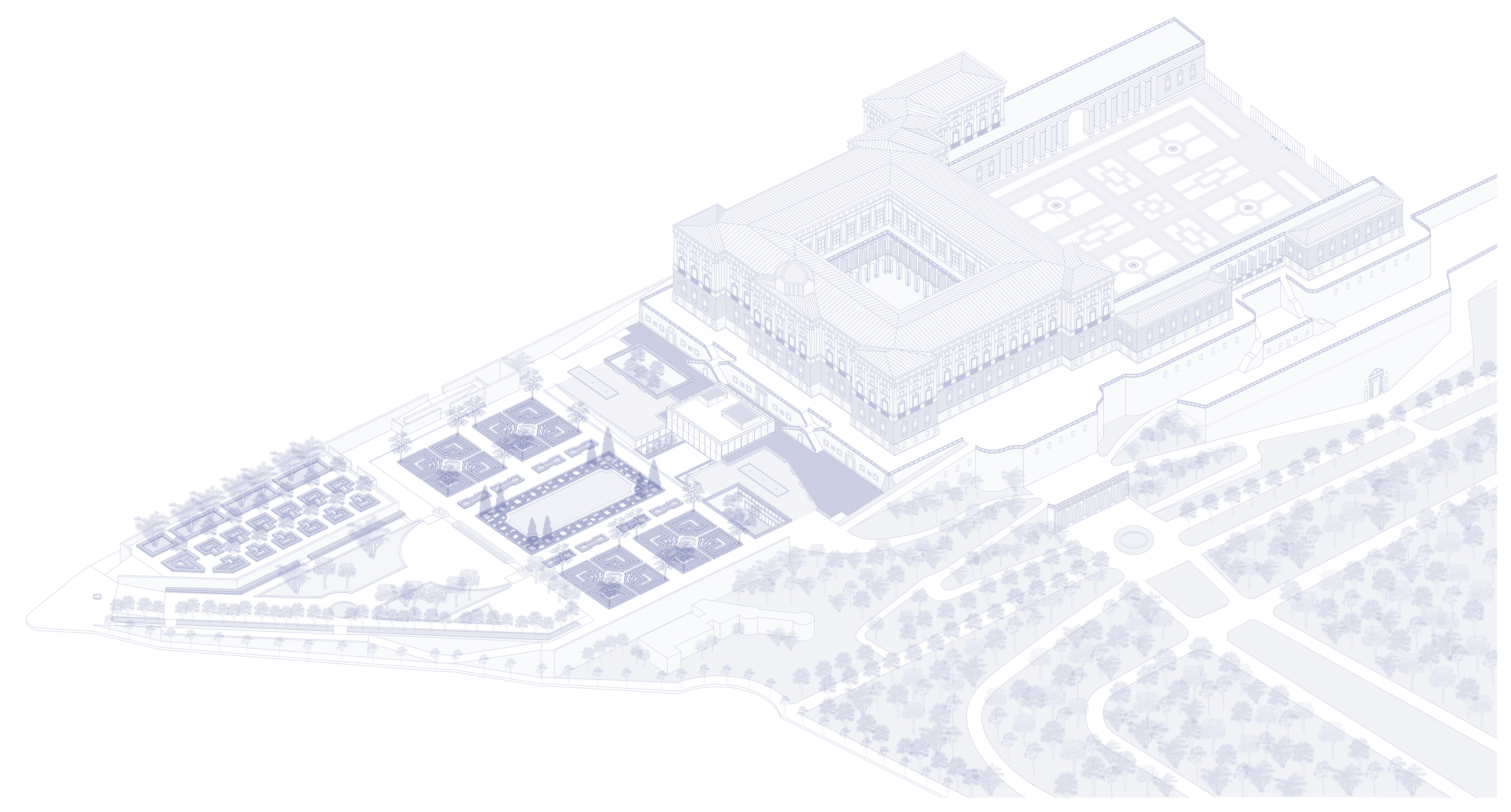 Para evitar competir con la Fachada Norte del Palacio Real, preservar su protagonismo y establecer conexiones directas con los jardines que rodean al mismo, se plantea un paisaje telúrico, es decir, un entorno formado a partir del moldeado del suelo en conjunción con la arquitectura, enterrada bajo la cota de la plaza y conformada por dos plantas que albergarán nuevos usos de interés turístico y cultural, todos ellos ligados a la música: museo para la colección palatina de Stradivarius, escuela de luthería, auditorio… Se genera por tanto un nuevo espacio que reconectará el Palacio Real y sus alrededores con la ciudad de Madrid.
