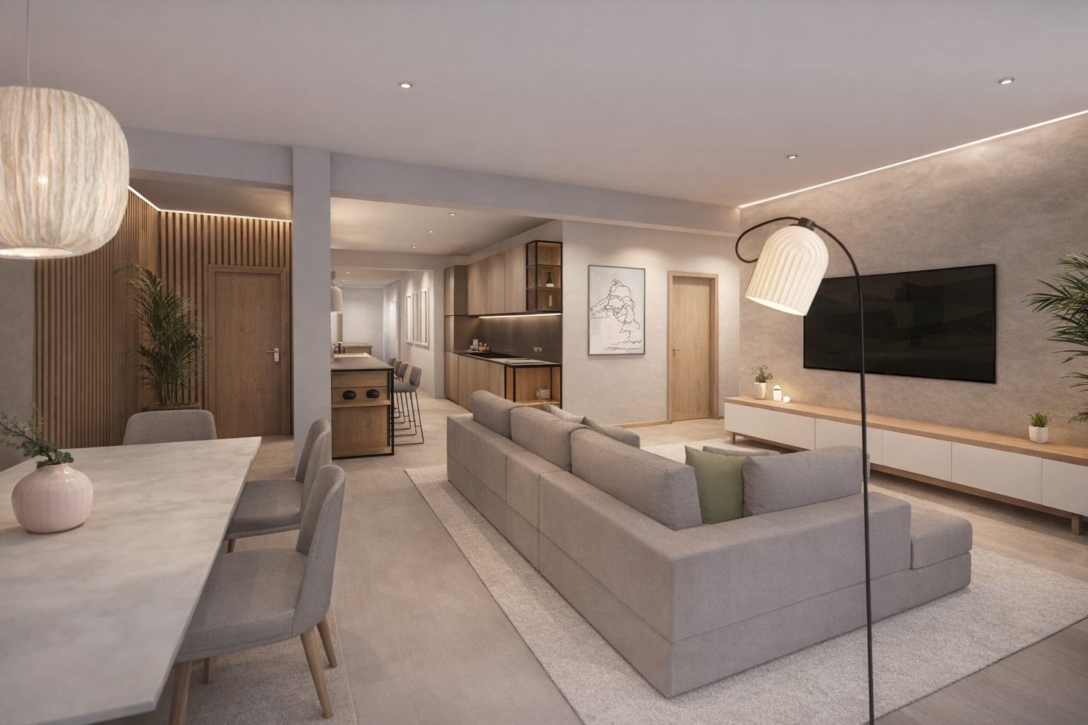 La intervención se apoya en una reorganización clara de la vivienda, donde los espacios de día se articulan de manera continua, favoreciendo la relación visual y funcional entre cocina, comedor y salón. Esta continuidad se refuerza mediante una paleta material homogénea, basada en tonos neutros y cálidos, donde la madera adquiere un papel protagonista aportando calidez y cohesión al conjunto.
