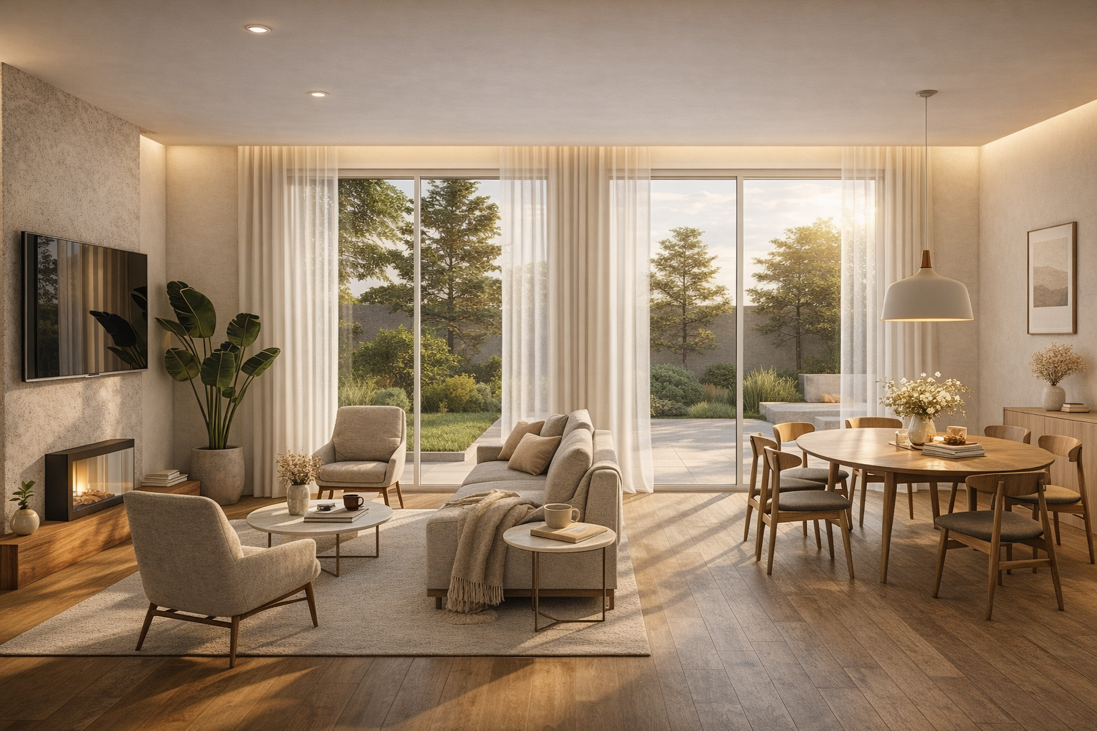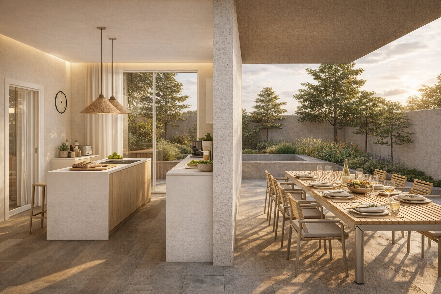 La vivienda se organiza para volcarse hacia el jardín posterior, entendido como un pequeño oasis de intimidad desde el que se capta la luz natural, verdadero eje del proyecto. En torno a ella se disponen los espacios, junto a una materialidad cálida que refuerza una atmósfera serena y acogedora.