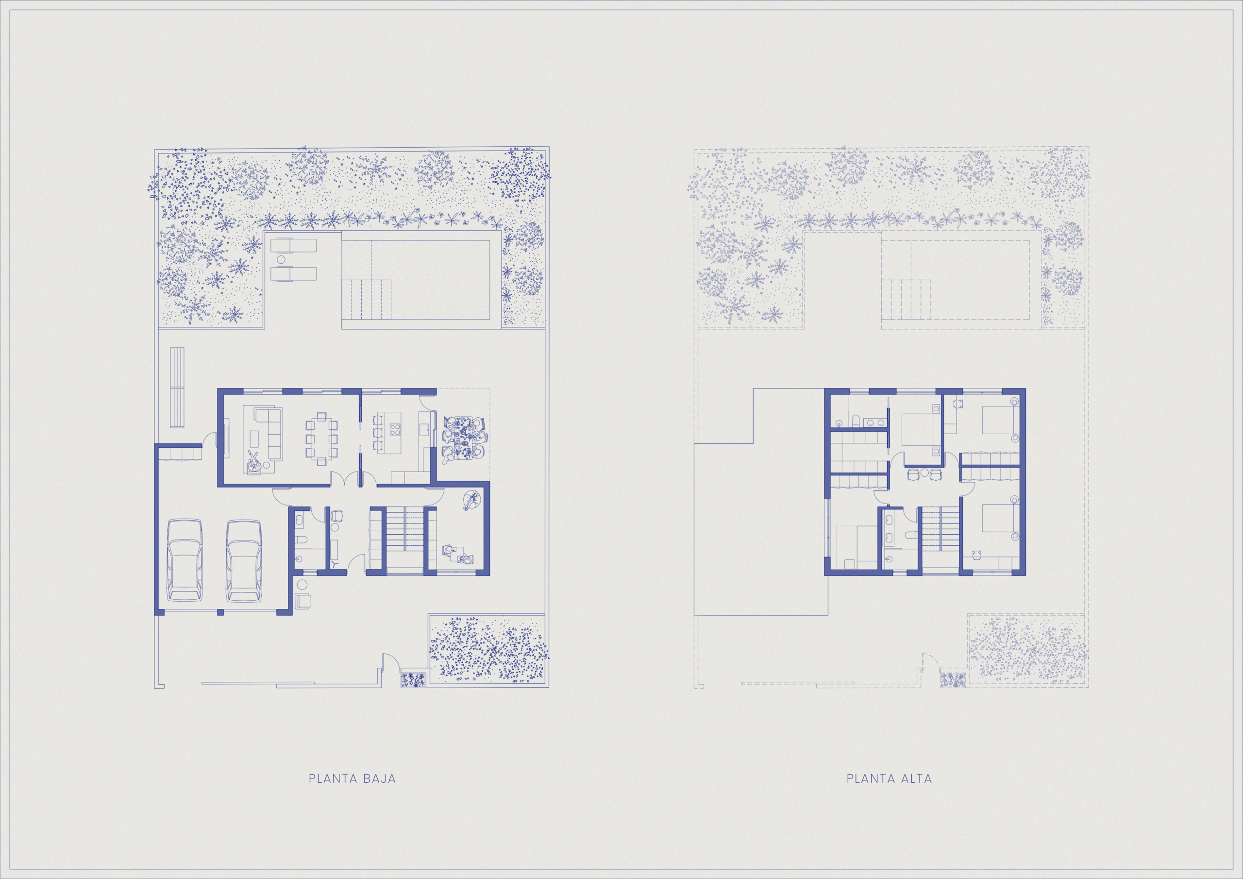 El programa se distribuye en dos niveles: la planta baja alberga la zona de día —cocina, comedor y salón— en relación directa con el exterior, mientras que la planta superior, más compacta, recoge los espacios privados y optimiza el rendimiento energético de la vivienda.